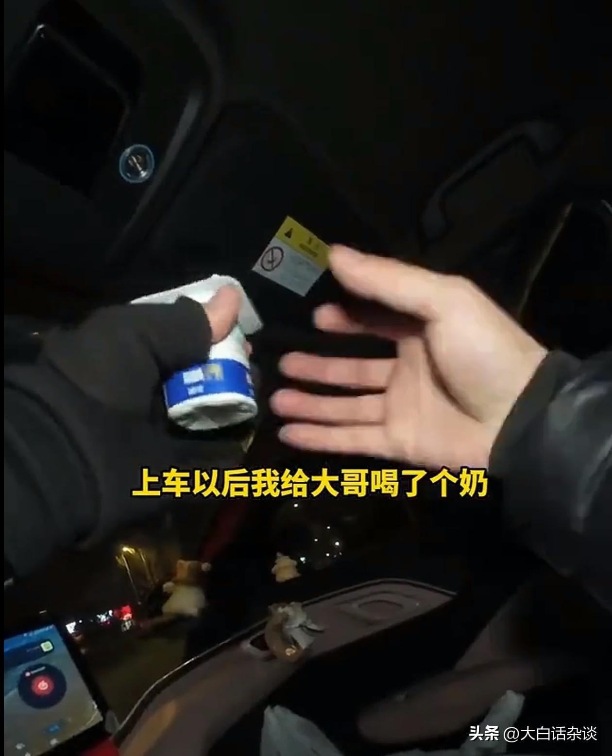 据哀先生透露,当时正值深夜,见到车主后感觉他喝了不少酒,因为怕他在乘车的过程中发生呕吐,就事先让他先喝了一盒奶。